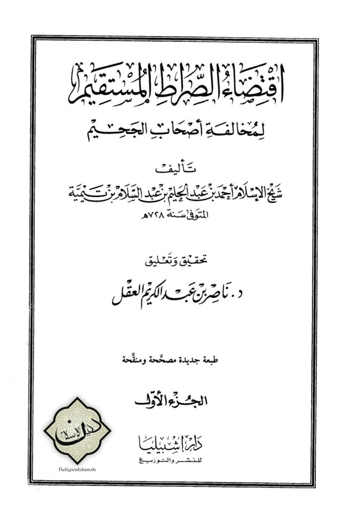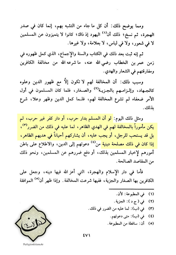 „Wenn der Muslim in Dār al-Ḥarb oder einem Dār des Kufrs, ohne Krieg, ist, wurde er nicht beauftragt mit der Abgrenzung zu ihnen (den Kuffār) in der äußerlichen Art und Weise, wegen dessen, was vom Schaden darin für ihn ist. Vielmehr kann es für den Mann empfehlenswert, oder verpflichtend sein, dass er sich manchmal beteiligt an ihrer äußerlichen Art und Weise, wenn in jenem ein Nutzen (maṣlaḥa) vom Dīn (für den Dīn) ist“