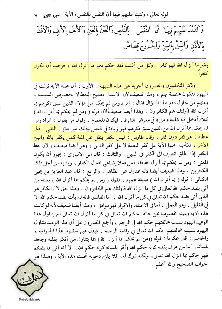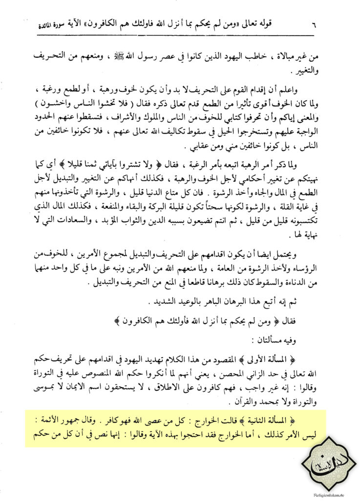 „Die dritte Angelegenheit: Die Khawārij sagten: ‚Jeder, der gegenüber Allāh ungehorsam war, so ist er ein Kāfir‘. Und die Allgemeinheit der Imāme sagte: ‚Die Angelegenheit ist nicht so (wie sie behaupten)‘. Was die Khawārij anbelangt, so haben sie diesen Vers (Sure 5 Vers 44) als Argument angeführt und sie sagten: ‚Es ist ein Text bezüglich, dass jeder, der mit etwas anderem richtet als was Allāh herabgesandt hat, ein Kāfir ist. Und jeder, der gesündigt hat, der hat mit etwas anderem gerichtet, als was Allāh herabgesandt hat. So bedingt es, dass er ein Kāfir ist‘ Die Kalām- und Tafsīr-Gelehrten erwähnten Antworten über diesen Einwand.