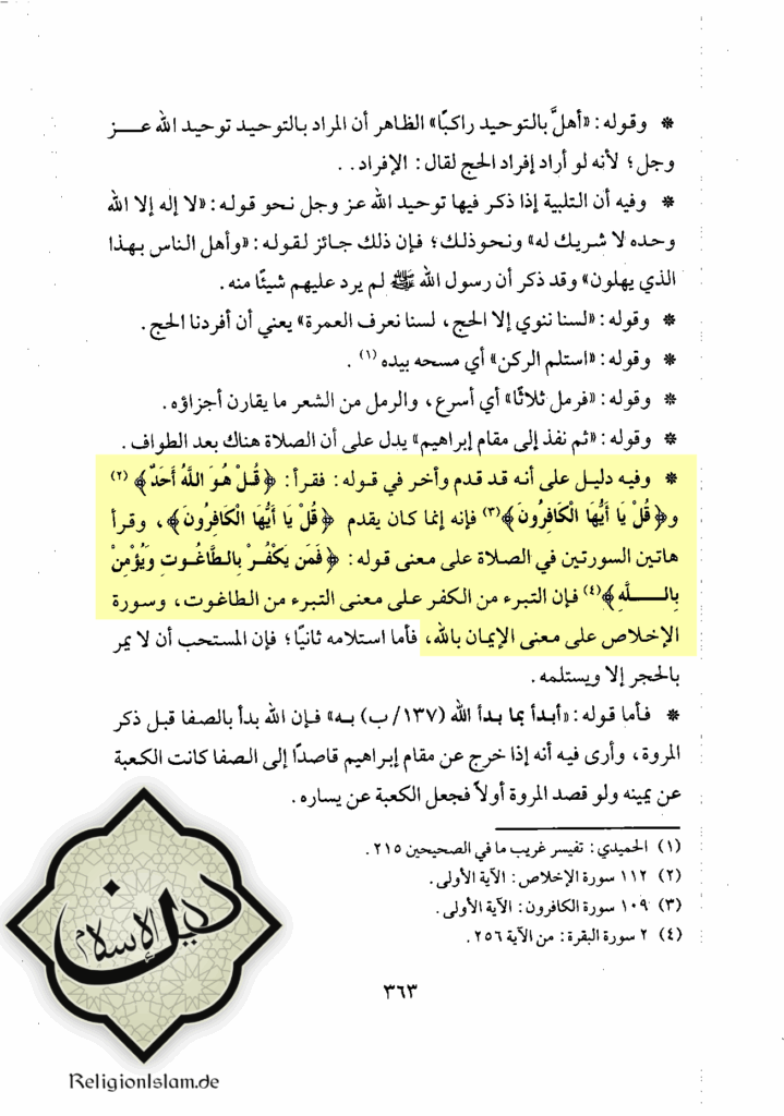 Und er rezitierte diese zwei Suren im Gebet gemäß der Bedeutung Seiner Aussage: «So wer Kufr an den Tāghūt macht und an Allāh glaubt» [2:256]Denn das sich Lossagen (Barā’a) vom Kufr ist gemäß der Bedeutung vom sich Lossagen vom Tāghūt. Und die Surat al-Ikhlāṣ ist gemäß der Bedeutung des Glaubens an Allāh.“