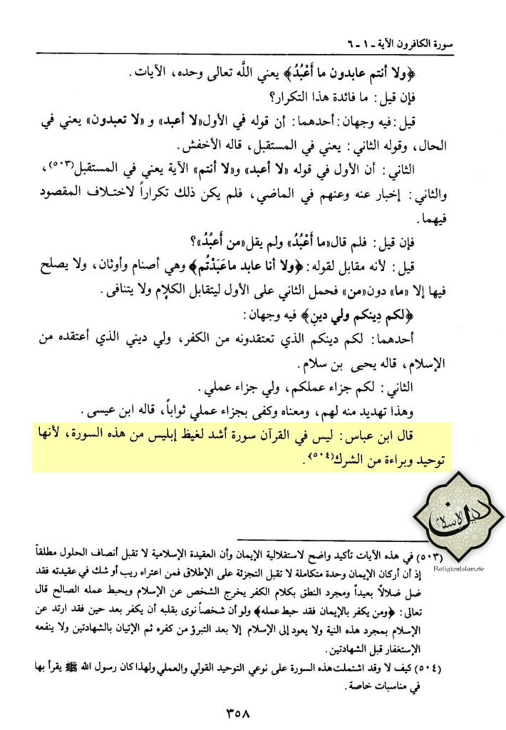 „Ibn ʿAbbās sagte: Im Qurʾān ist keine Sure, die Iblīs zorniger macht, als diese Sure, denn sie ist Tauhīd und Lossagung (barāʾa) vom Shirk“