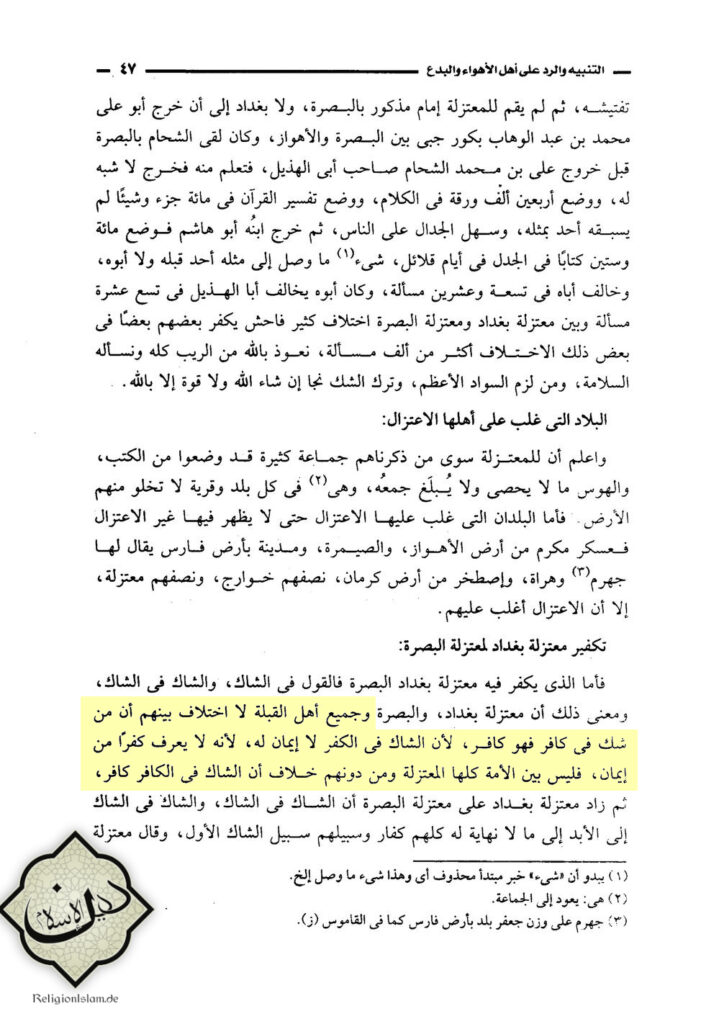 „Die Gesamtheit der Ahl al-Qibla (alle Muslime), keine Meinungsverschiedenheit ist zwischen ihnen, dass wer (am Kufr) eines Kāfirs zweifelt, so ist er ein Kāfir. Denn der Zweifler über den Kufr hat keinen Īmān. Weil er nicht Kufr von Īmān unterscheiden kann. So gibt es unter der ganzen Umma, den Muʿtazila und (die) außer ihnen (die anderen Gruppen), keine Meinungsverschiedenheit, dass der Zweifler über den Kāfir, ein Kāfir ist“