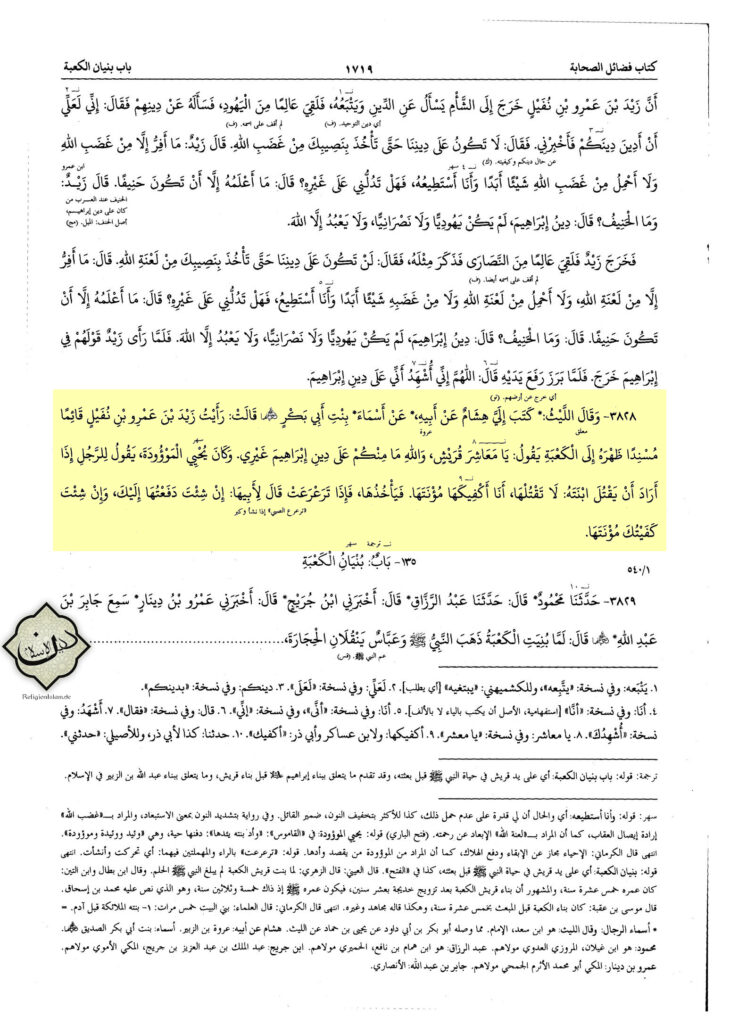 „Layth sagte: Hishām schrieb mir von seinem Vater von Asmāʾ bint Abī Bakr, möge Allāh mit ihr zufrieden sein, sie sagte: Ich sah Zayd bin ʿAmr bin Nufayl stehen, sein Rücken gestützt zur Kaʿba, er sagte: ‚O Versammlung der Quraysh, bei Allāh von euch ist niemand auf dem Dīn von Ibrāhīm, außer mir‘