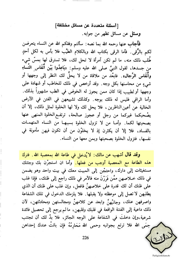 „Und (Imām) Ashhab (gest. 204 هـ) sagte von (Imām) Mālik: ‚In die Gehorsamkeit zu Allāh wird nicht eingetreten, durch Ungehorsam zu Allāh‘. So ist das Unterlassen dieser Gehorsamkeit mit dem Ungehorsam verpflichtender als ihre Umsetzung (der Gehorsamkeit)“