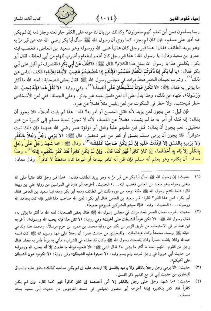 „Und er (der Prophet), Allāhs Segen und Frieden auf ihm, sagte: ‚Kein Mann bezeugte gegen einen (anderen) Mann den Kufr, außer einer von beiden kehrte damit zurück. Wenn er ein Kāfir war, so ist er, wie er gesagt hat. Und wenn er kein Kāfir war, so wurde er Kāfir durch seinen Takfīr auf ihn‘